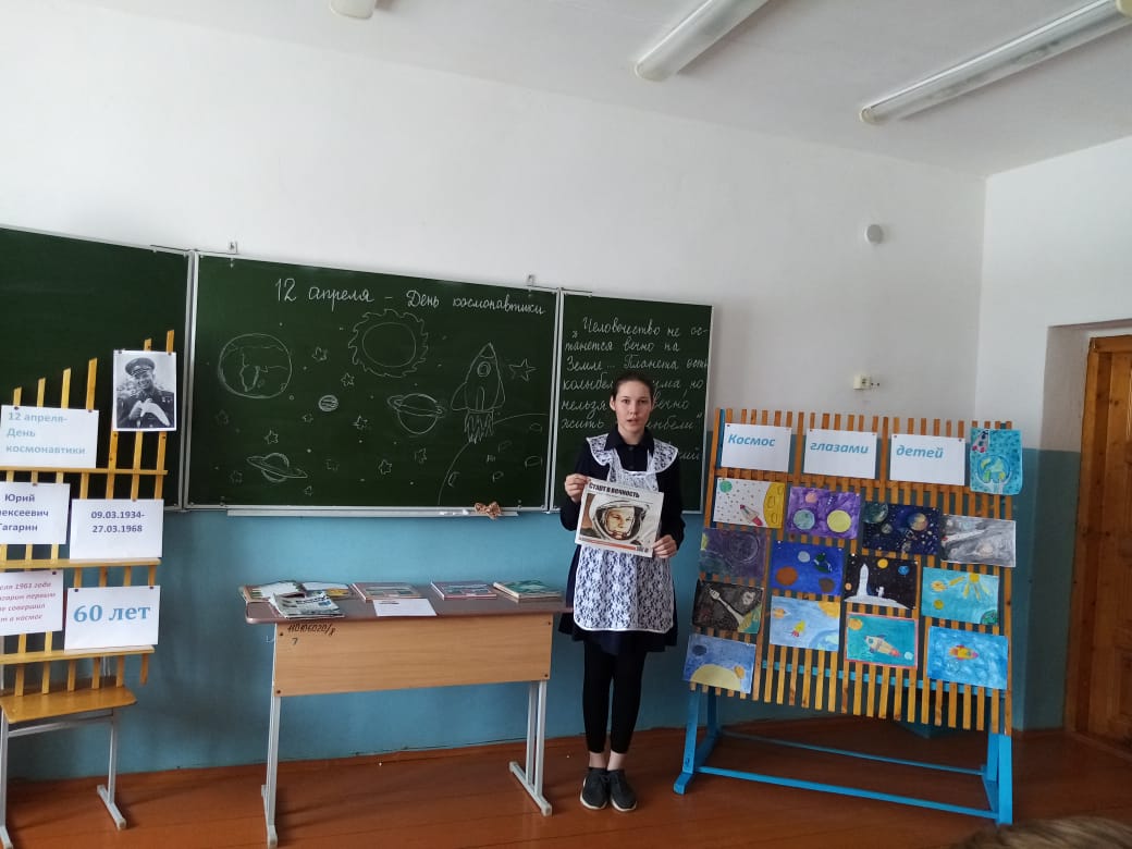 Обучающиеся прочли стихотворения, отгадывали загадки о космосе, беседовали, участвовали в викторине, посмотрели видеофильмы. Также в начальных классах были проведены такие эстафеты как: «Космодром», «Построй ракету», «Займи место в ракете», «Полет на Луну», «Невесомость». Все ребята с большим интересом участвовали в эстафетах, старались победить.Школьный библиотекарь организовала выставку в библиотеке.
