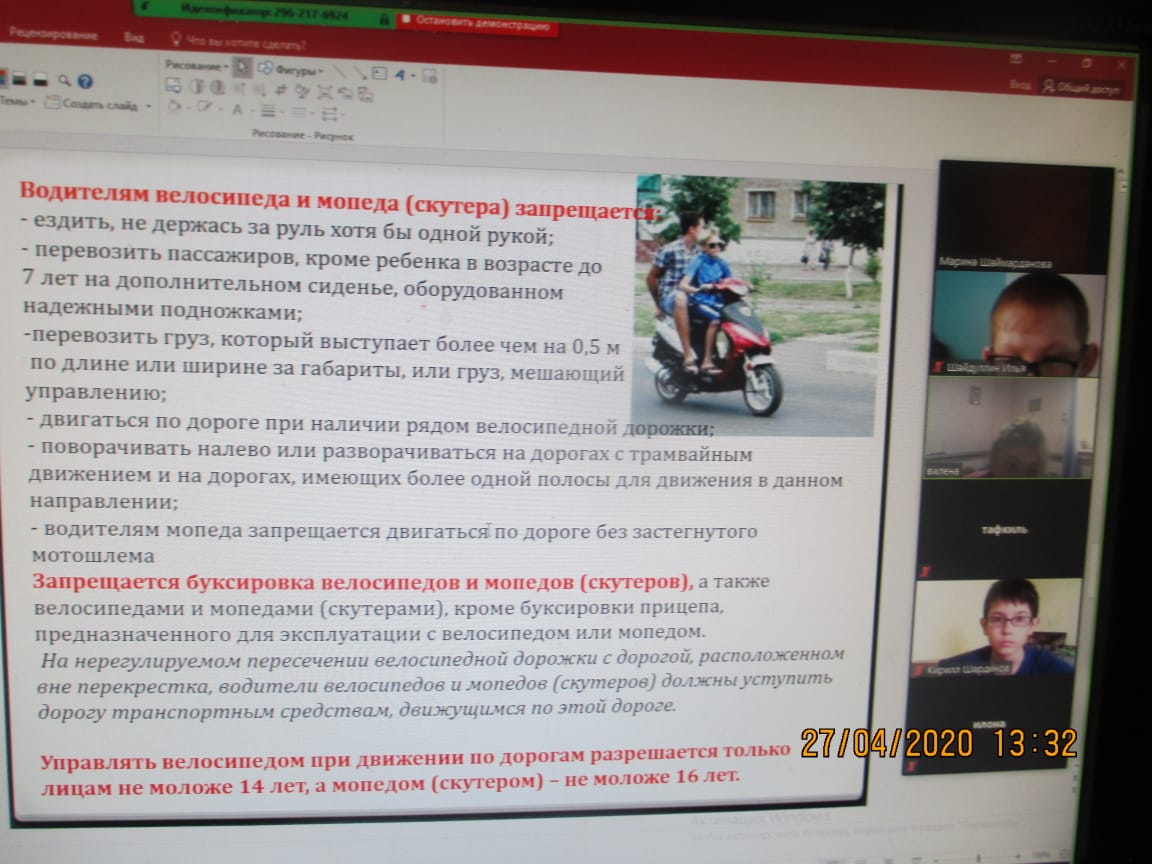 28 апреля 2020 года классные руководители 5 и 8 классов провели онлайн уроки с просмотром видеороликов по правилам дорожного движения, направленное на пропаганду соблюдения Правил дорожного движения при езде на велосипедах, самокатах и мопеде, формирование навыков безопасного участия в дорожном движении.