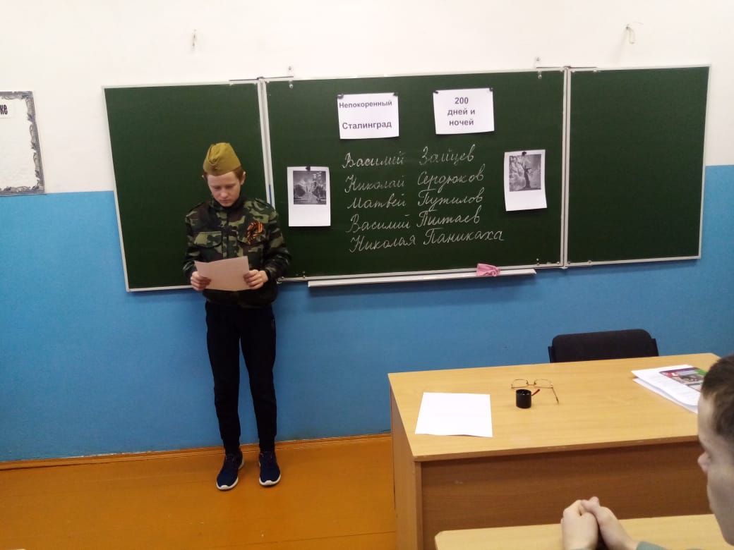 2 февраля в нашей школе прошли классные часы, посвященное этой битве. Ученики уточнили и расширили свои знания о Сталинградской битве, ее значении. Целью мероприятия было сформировать чувство патриотизма, сплоченности и ответственности, воспитать уважение к прошлому и настоящему своей страны. Ребята рассказали об историческом моменте, о тяжелых днях войны под Сталинградом, читали стихотворения о Сталинграде.